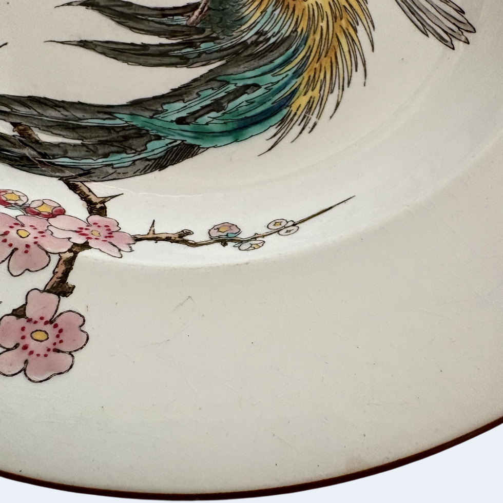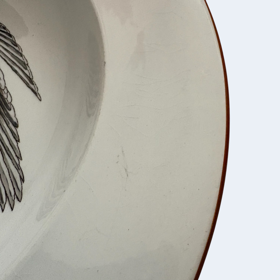 Petit passage du temps : des petites craquelures un peu marron sur le pourtour (10h/ 8h/6h/3h), il y a de la peinture bleue du décor diffuse dans la porcelaine à gauche de la queue. Un tout petit manque d'émaillage d'origine sur le pourtour à 8h00. Une tâche de peinture d'origine à gauche de l'abeille. Au verso un bord plus épais bleuté (d'origine).